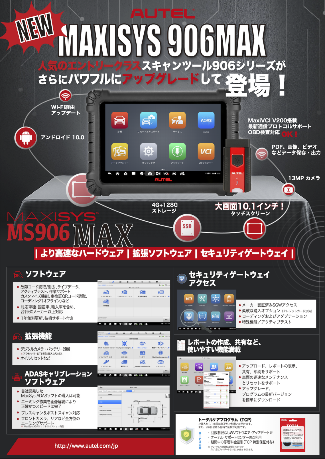 Autel MaxiSys MS906 Max は、人気の906シリーズをさらに高速化・高性能化した 次世代ミドルクラススキャンツールです。 10.1インチの大画面タッチスクリーン、SSDストレージによる素早い起動、 そしてAndroid 10を採用した最新プラットフォームにより、 日々の診断作業をよりスムーズに、より正確に進めることができます。