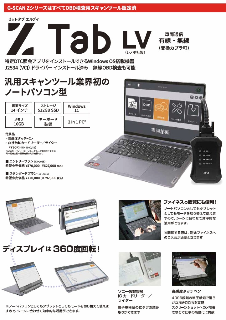 | 構成 | Z 本体+専用OBDインターフェース+Windowsタブレット(Z Tab LV) |