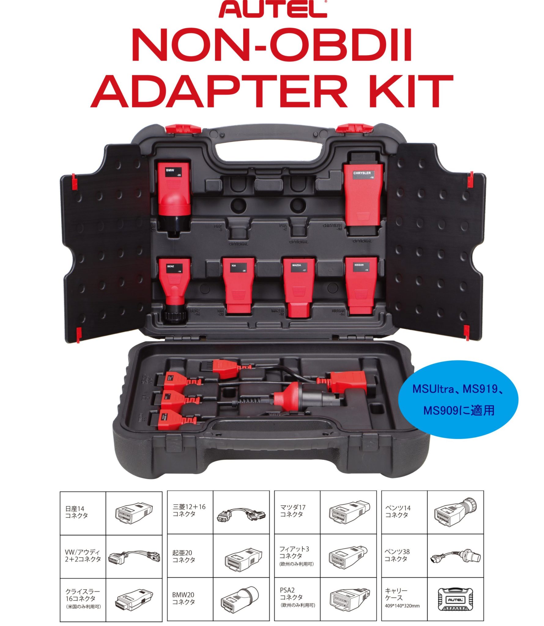 MSUltra、MS919、およびMS909と互換性があるMSOBD2KITには、1996年から2002年の間に製造された標準のOBD2ピンを搭載していない特定な車両に適用のOE準拠のコネクタが含まれています。 コネクタには、日産-14、三菱12+16、起亜20、BMW-20、ベンツ-38、VW /アウディ-2+2、マツダ-17、クライスラー-16、ベンツ-14が含まれています。