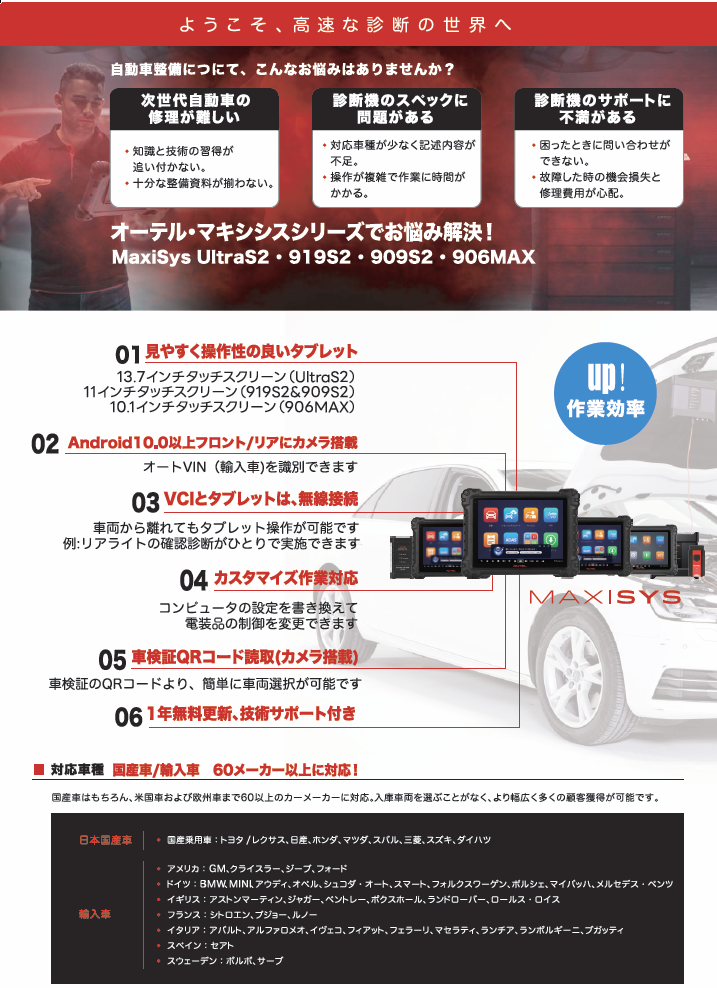 | モデル | MaxiDas DS900 | MaxiSys 906Pro *1 MaxiSys 906Max *2 | MaxiSys 909 *1 MaxiSys 909S2 *2 | MaxiSys 919 *1 MaxiSys 919S2 *2 | MaxiSys Ultra *1 MaxiSys UltraS2 *2 |