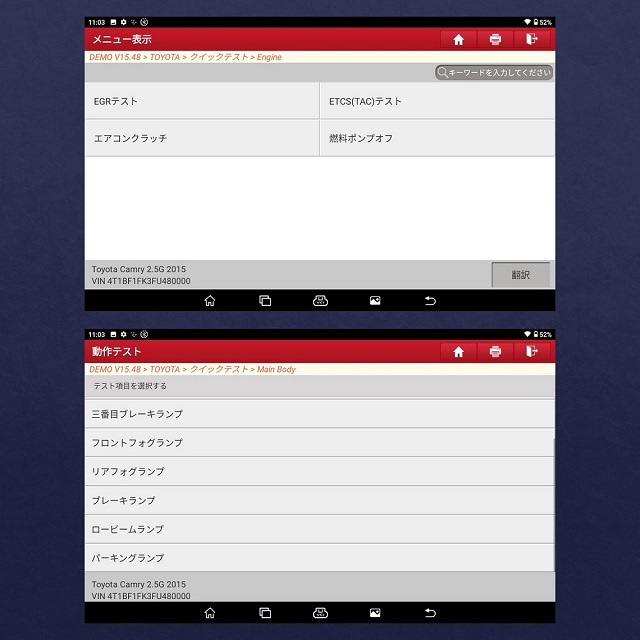 ※1 ブレーキリセット、メンテナンスリセット、ステアリングリセット、バッテリーマッチング、ABSエア抜き、電子スロットル再学習、TPMSリセット、DPF再生、ACシステム学習/初期化、アドブルーリセット、エア/燃料リセット、エアレベルリセット、クーラントエア抜き、クランクポジションセンサー適応学習、EGRアダプテーション、エンジンパワーバランス燃料、GPF再生、ギアボックス再学習、高電圧バッテリー診断、イモビライザーリセット、インジェクターコーディング、インテリジェントクルーズコントロールシステム、言語変更、Noxセンサーリセット、シート校正、ストップ/スタートリセット、タイヤリセット、輸送モード解除、パワーウィンド初期化
