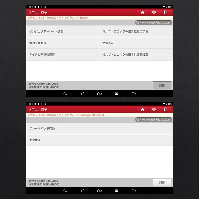 ※1 ブレーキリセット、メンテナンスリセット、ステアリングリセット、バッテリーマッチング、ABSエア抜き、電子スロットル再学習、TPMSリセット、DPF再生、ACシステム学習/初期化、アドブルーリセット、エア/燃料リセット、エアレベルリセット、クーラントエア抜き、クランクポジションセンサー適応学習、EGRアダプテーション、エンジンパワーバランス燃料、GPF再生、ギアボックス再学習、高電圧バッテリー診断、イモビライザーリセット、インジェクターコーディング、インテリジェントクルーズコントロールシステム、言語変更、Noxセンサーリセット、シート校正、ストップ/スタートリセット、タイヤリセット、輸送モード解除、パワーウィンド初期化