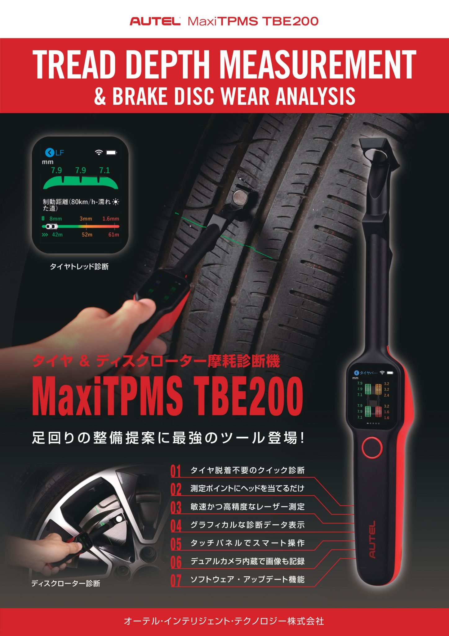 MaxiTPMS TBE200は、迅速かつ正確にタイヤ溝の深さとブレーキローターの摩耗状態をレーザーで測定できるツールです。タイヤを脱着せずにブレーキローターの摩耗状態を測定できます。 1.65インチのカラー有機LEDタッチスクリーンに測定した、タイヤの摩耗状態をリアルタイムで表示します。偏摩耗等の詳細なタイヤの状態をイラストで確認でき、迅速にメンテナンスサービスの案内を提供できます。デュアルカメラにて、タイヤ識別番号(TIN)をスキャンし、タイヤの摩耗状態と損傷を記録します。 MaxiTPMS TBE200とITS600とセットで使用することにより、詳細なTPMSレポートを閲覧および印刷することも可能です。