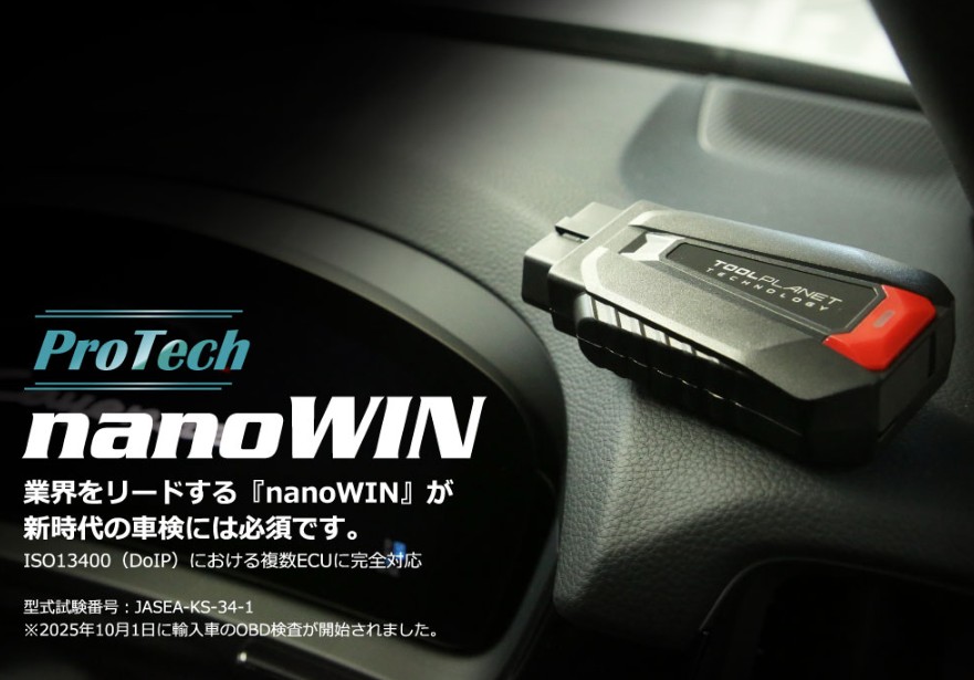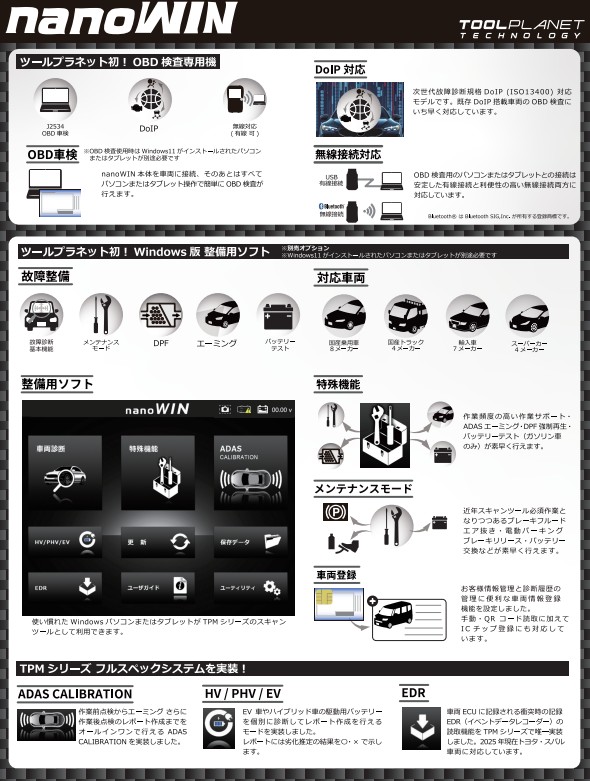ToolPlanet nanoWIN は、OBD診断・故障コード消去・エーミングサポート・メンテナンスリセットなど、